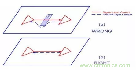在 PCB 設(shè)計(jì)中一個(gè)常見(jiàn)的錯(cuò)誤是在層間打過(guò)孔和開(kāi)槽。圖3顯示了當(dāng)一條信號(hào)線在一個(gè)開(kāi)過(guò)槽的不同層上的電流流向?;芈冯娏鲗⒈黄壤@過(guò)開(kāi)槽,這就必然會(huì)產(chǎn)生一個(gè)大的環(huán)流回路。