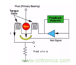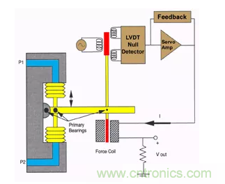 如果對這個組件施加加速度,就會對質(zhì)量施加一個力,它將試圖從零位置移動。當零檢測器檢測到運動時,通過伺服放大器增加線圈電流以保持零位置。