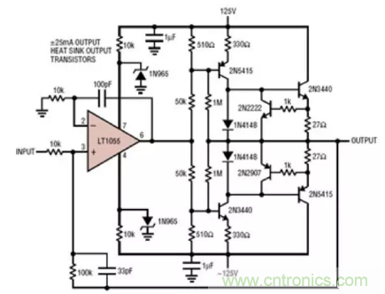 圖1:為了提升運(yùn)算放大器的電壓輸出,一種方法是為Analog Devices的LT1055等基本器件加裝補(bǔ)償升壓晶體管,來利用運(yùn)算放大器的輸入特性;這種設(shè)計(jì)可輸出±120V電壓。(圖片來源:Analog Devices)