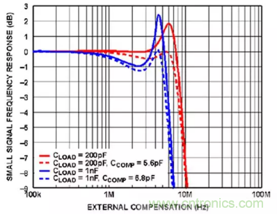 圖4:在單位增益、±110V供電電壓、VOUT = 100Vp-p、Rf = 0Ω 及 CCOMP = 5.6皮法 (pF) 時(shí),ADHV4702-1的小信號(hào)頻率響應(yīng)與外部補(bǔ)償?shù)年P(guān)系曲線圖。(圖片來源:Analog Devices)