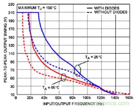 動(dòng)態(tài)SOA也是要關(guān)注的方面。ADHV4702-1采用了內(nèi)部壓擺率升壓電路來實(shí)現(xiàn)19兆赫 (MHz) 小信號(hào)帶寬和74伏/微秒 (µs) 的壓擺率,但這種升壓電路可能會(huì)消耗大電流,具體取決于信號(hào)。為此,使用ADHV4702-1加裝外部二極管可限制差分輸入電壓(圖9)。