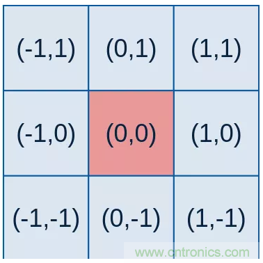 其中(x,y)(x,y)為點坐標,在圖像處理中可認為是整數(shù);σσ是標準差。要想得到一個高斯濾波器的模板,可以對高斯函數(shù)進行離散化,得到的高斯函數(shù)值作為模板的系數(shù)。例如:要產(chǎn)生一個3×33×3的高斯濾波器模板,以模板的中心位置為坐標原點進行取樣。模板在各個位置的坐標,如下所示(x軸水平向右,y軸豎直向下)