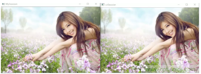 下圖是自己實現(xiàn)的高斯濾波器和OpenCV中的GaussianBlur的結(jié)果對比