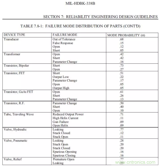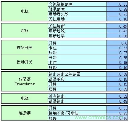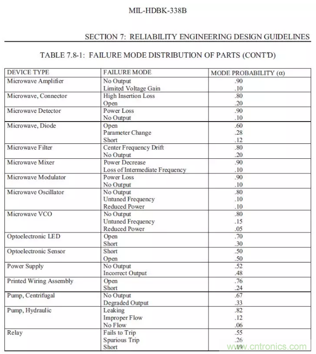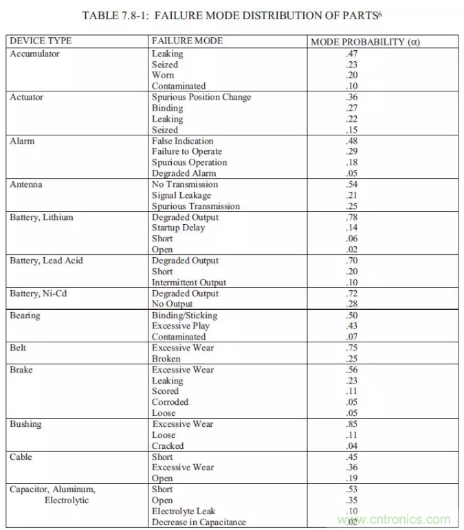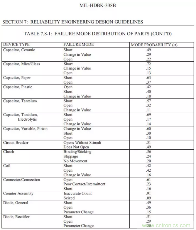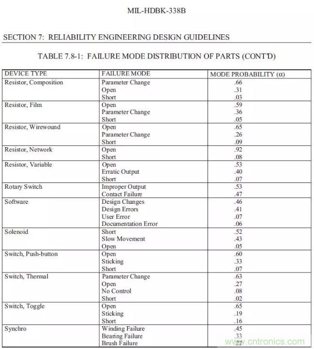 【導(dǎo)讀】以下總結(jié)摘錄MIL-HDBK-338B,美軍可靠性設(shè)計手冊來為FTA(故障樹)做一些支持。如果我們想要進(jìn)行FTA的定量分析,一定要把可靠性預(yù)測先做完,在可靠性前一定要把電壓分布表和溫度分布先進(jìn)行初步的運算,通過下面的的表格,大概可以預(yù)計失效發(fā)生的時候故障的分配比例。
