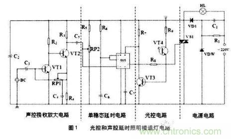 但從多年從事電子技術教學的經驗中,我覺得識讀電子電路原理圖還是有一定方法可以遵循的,下面分享一些結合光控和聲控延時照明樓道燈電路(圖1)做的總結。