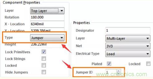 1.要設(shè)置為跳線的組件類型。2.跨接導(dǎo)線組件中的兩個極板的跳線ID設(shè)置為相同的非零值。注:一旦設(shè)置了組件類型和襯墊跳轉(zhuǎn)屬性,組件就會表現(xiàn)為跳線器。