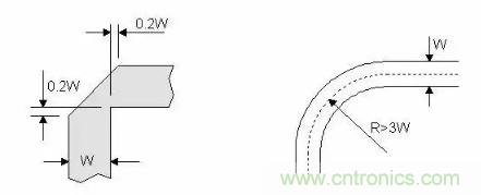 RF信號(hào)線如果走直角,拐角處的有效線寬會(huì)增大,阻抗不連續(xù),引起信號(hào)反射。為了減小不連續(xù)性,要對拐角進(jìn)行處理,有兩種方法:切角和圓角。圓弧角的半徑應(yīng)足夠大,一般來說,要保證:R>3W。如圖右所示。