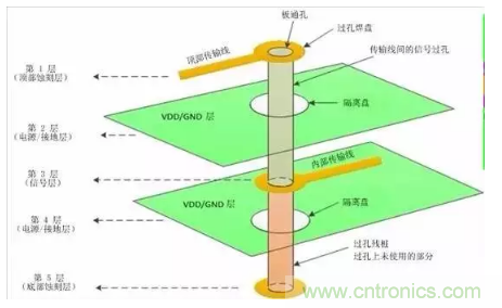 過孔是鍍在電路板頂層與底層之間的通孔外的金屬圓柱體。信號(hào)過孔連接不同層上的傳輸線。過孔殘樁是過孔上未使用的部分。過孔焊盤是圓環(huán)狀墊片,它們將過孔連接至頂部或內(nèi)部傳輸線。隔離盤是每個(gè)電源或接地層內(nèi)的環(huán)形空隙,以防止到電源和接地層的短路。