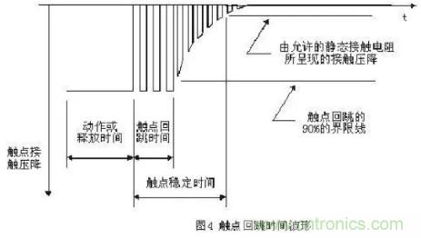 回跳時間包括吸合回跳時間和釋放回跳時間。由于繼電器是采用有彈性的機械觸點完成線路的接通和斷開,因此不同于由半導體器件組成的無觸點電子開關(guān),當繼電器的觸點接通或斷開的瞬間會有一段不穩(wěn)定的接觸期,典型的觸點波形見圖4。