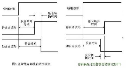 轉(zhuǎn)換時間包括吸合轉(zhuǎn)換時間和釋放轉(zhuǎn)換時間。以吸合轉(zhuǎn)換時間為例,繼電器在吸合過程中,靜合點斷開時間與動合點吸合時間之差稱為吸合轉(zhuǎn)換時間。圖5和圖6分別顯示了合格繼電器和失效繼電器的吸合轉(zhuǎn)換波形。