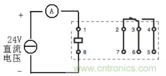 b、額定電流測試:對繼電器1、8腳供直流24V電,等30秒讀取電流表數(shù)據(jù) 注意:電流測試,萬用表表筆插至電流輸入端口,并調(diào)整電流檔對應的量程檔位(mA)。