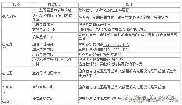 雖然每家的故障代碼可能會有差異,但是一般離不開過流(OC),過載(OL),過壓(OU),欠壓(LU),過熱(OH)等著幾類,理論這些可以根據(jù)手冊的要求來操作,流程都是傻瓜式的。實際一般用戶能處理的,就是確保輸入電壓正常,電機連接線正常,電機絕緣沒有問題,電機三相平衡等,然后調(diào)整一下加減速時間等簡單處理,下邊說一些手冊上沒有的故障,這些故障你見過嗎,知道如何處理嗎,一起來看看。