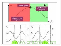 分析一下諧振頻率的方程式就會發(fā)現(xiàn),在高于峰值增益頻率時,諧振網(wǎng)絡的輸入阻抗是感抗,諧振網(wǎng)絡的輸入電流(Ip)滯后于諧振網(wǎng)絡的輸入電壓(Vd)。在低于峰值增益頻率時,諧振網(wǎng)絡的輸入阻抗變?yōu)槿菘?,并且Ip領先Vd。在電容區(qū)工作時,體二極管在MOSFET開關期間執(zhí)行反向恢復操作。