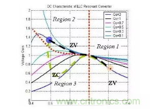 黑虛線代表負載變化期間的理想路徑,而綠虛線表示實際路徑。在負載從低變高的過程中,可以看到系統(tǒng)經(jīng)過ZCS區(qū)域,因此,寄生體二極管的性能變得非常重要。出于這個原因,新LLC設計的趨勢是使用體二極管恢復時間非常短的功率器件。