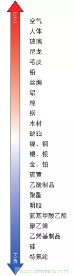 在該“帶電序列”中,正方向上的物體帶正電而負(fù)方向上的物體帶負(fù)電。此外,隨著物體在序列中距離的增加,相互之間摩擦?xí)r產(chǎn)生的靜電量也會(huì)越大。