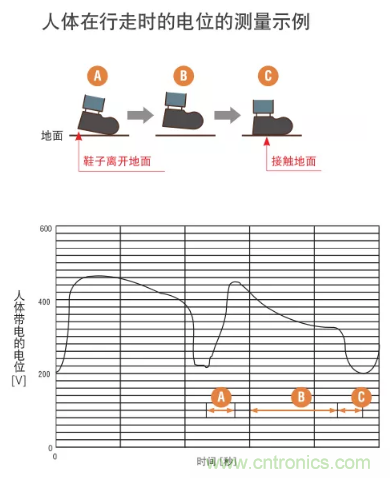 人體中有 80% 以上是水,因此靜電很容易流過人體。穿著鞋時(shí),鞋底充當(dāng)了絕緣體,防止靜電流動(dòng)。這樣所產(chǎn)生的靜電就會(huì)聚集起來,無法釋放。下圖表明了人在行走時(shí)產(chǎn)生的靜電量。