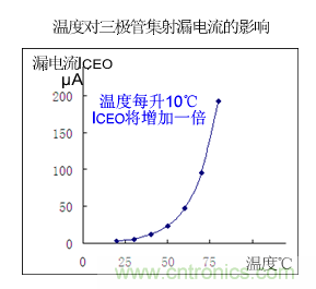 ICEO是由少數(shù)載流子漂移運(yùn)動形成的,它與環(huán)境溫度關(guān)系很大,ICEO隨溫度上升會急劇增加。溫度上升10℃,ICEO將增加一倍。