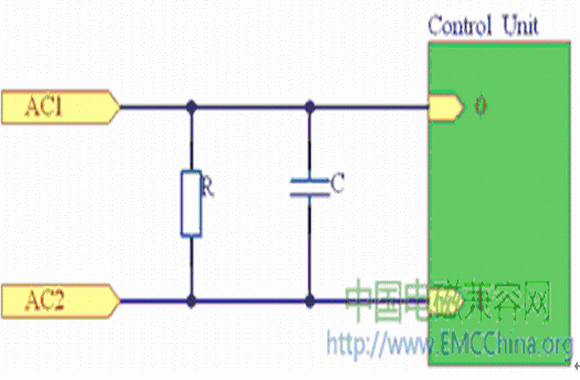 為了防止控制板電路產(chǎn)生的傳導干擾,可在電路的進入口(即AC兩端)并接上一個電容C,圖1所示是一個簡單的電容抗擾電路連接圖。圖中的電容屬于安全電容,但必須在該電容的兩端并聯(lián)一個安全電阻,以防止電源線拔插時電源線插頭長時間帶電。因為安全標準規(guī)定,當正在工作之中的機器電源線被拔掉時,在兩秒鐘內(nèi),電源線插頭兩端所帶的電壓(或?qū)Φ仉娢?應小于原來電壓的30%。