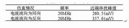 由仿真結(jié)果可知,電流流向為反向時的遠端串?dāng)_峰值(357.6mm)要大于電流流向為同向時的遠端口串?dāng)_峰值(260.5)。同時由圖4可以看到,當(dāng)干擾源的電流流向改變后,被干擾源的串?dāng)_極性也改變了。這說明串?dāng)_的大小和極性與相應(yīng)干擾源上信號的電流流向有關(guān)的。