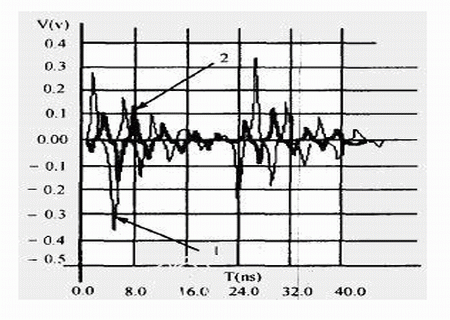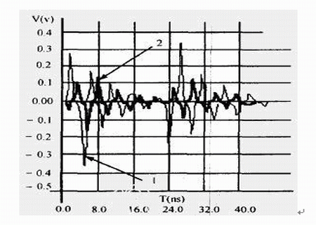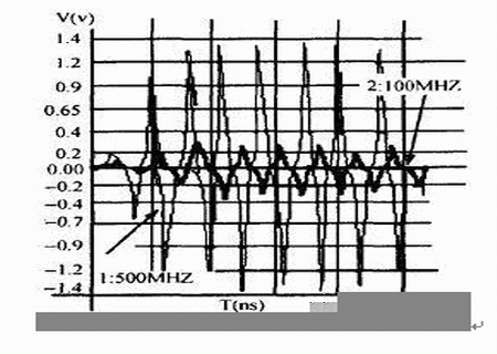 干擾源信號頻率越高,被干擾對象上的串?dāng)_幅值越大,我們對圖1中干擾源網(wǎng)絡(luò)AB上的信號頻率f1分別取不同頻率值時,對被干擾對象上的串?dāng)_進行了仿真,仿真結(jié)果見表2,信號頻率不同時的串?dāng)_波形見圖5,標(biāo)記為“1”、“2”箭頭所指的波形頻率分別為“500MHz”、“100MHz”。