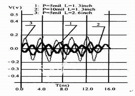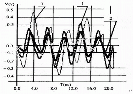 對于圖1所示的兩線系統(tǒng),我們進行了三種情況的仿真(線網(wǎng)AB上的信號頻率均為100MHz)仿真結(jié)果見表3,及圖6.:第一種情況是在兩線間距和平行長度不變的條件下,探測被干擾對象的串?dāng)_(標(biāo)記“1”);第二種情況是在兩線平行長度不變的前提下,將兩線間距增加到10mils,然后探測被干擾對象的串?dāng)_標(biāo)記“2”;第三種情況是在兩線間距不變的條件下,將兩線的平行長度增加到2.6inches標(biāo)記“3”,然后探測被干擾對象的串?dāng)_。由仿真結(jié)果可見,當(dāng)兩線的間距拉大時(P由5mils變?yōu)?0mils),串?dāng)_明顯地減小了,而當(dāng)兩線的平行長度加長時(L由1.3inches變?yōu)?.6inches),串?dāng)_顯著增大了。