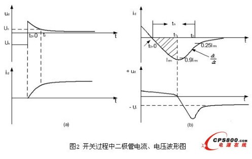 開(kāi)關(guān)管工作在硬開(kāi)關(guān)條件下開(kāi)關(guān)電源自身產(chǎn)生電磁干擾的根本原因,就是在其工作過(guò)程中的開(kāi)關(guān)管的高速開(kāi)關(guān)及整流二極管的反向恢復(fù)產(chǎn)生高di/dt和高dv/dt,它們產(chǎn)生的浪涌電流和尖峰電壓形成了干擾源。開(kāi)關(guān)管工作在硬開(kāi)關(guān)時(shí)還會(huì)產(chǎn)生高di/dt和高dv/dt,從而產(chǎn)生大的電磁干擾。圖1繪出了接感性負(fù)載時(shí),開(kāi)關(guān)管工作在硬開(kāi)關(guān)條件下的開(kāi)關(guān)管的開(kāi)關(guān)軌跡,圖中虛線(xiàn)為雙極性晶體管的安全工作區(qū),如果不改善開(kāi)關(guān)管的開(kāi)關(guān)條件,其開(kāi)關(guān)軌跡很可能會(huì)超出安全工作區(qū),導(dǎo)致開(kāi)關(guān)管的損壞。由于開(kāi)關(guān)管的高速開(kāi)關(guān),使得開(kāi)關(guān)電源中的高頻變壓器或儲(chǔ)能電感等感性負(fù)載在開(kāi)關(guān)管導(dǎo)通的瞬間,迫使變壓器的初級(jí)出現(xiàn)很大的浪涌電流,將造成尖峰電壓。開(kāi)關(guān)管在截止期間,高頻變壓器繞組的漏感引起的電流突變,從而產(chǎn)生反電勢(shì)E=-Ldi/dt,其值與電流變化率(di/dt)成正比,與漏感量成正比,疊加在關(guān)斷電壓上形成關(guān)斷電壓尖峰,從而形成電磁干擾。此外,開(kāi)關(guān)管上的反向并聯(lián)二極管的反向恢復(fù)特性不好,或者電壓尖峰吸收電路的參數(shù)選擇不當(dāng)也會(huì)造成電磁干擾。由整流二極管的反向恢復(fù)引起的干擾源有兩個(gè),它們分別是輸入整流二極管和輸出整流二極管。它們都是由電流的換向引起的干擾。由圖2表明,t0=0時(shí)二極管導(dǎo)通,二極管的電流迅速增大,但是其管壓降不是立即下降,而會(huì)出現(xiàn)一個(gè)快速的上沖。其原因是在開(kāi)通過(guò)程中,二極管PN結(jié)的長(zhǎng)基區(qū)注入足夠的少數(shù)載流子,發(fā)生電導(dǎo)調(diào)制需要一定的時(shí)間tr。該電壓上沖會(huì)導(dǎo)致一個(gè)寬帶的電磁噪聲。而在關(guān)斷時(shí),存在于PN結(jié)長(zhǎng)基區(qū)的大量過(guò)剩少數(shù)載流子需要一定時(shí)間恢復(fù)到平衡狀態(tài)從而導(dǎo)致很大的反向恢復(fù)電流。當(dāng)t=t1時(shí),PN結(jié)開(kāi)始反向恢復(fù),在t1-t2時(shí)間內(nèi),其他過(guò)剩載流子依靠復(fù)合中心復(fù)合,回到平衡狀態(tài)。這時(shí)管壓降又出現(xiàn)一個(gè)負(fù)尖刺。通常t2《t1,所以該尖峰是一個(gè)非常窄的尖脈沖,產(chǎn)生的電磁噪聲比開(kāi)通時(shí)還要強(qiáng)。因此,整流二極管的反向恢復(fù)干擾也是開(kāi)關(guān)電源中的一個(gè)重要干擾源。