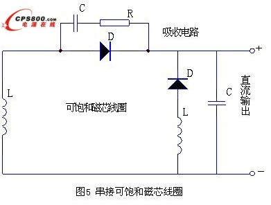 二次整流回路中,與整流二極管D串接可飽和磁芯的線(xiàn)圈,如圖5所示??娠柡痛判揪€(xiàn)圈在通過(guò)正常電流時(shí)磁芯飽和,電感量很小,不會(huì)影響電路正常上作。一旦電流要反向時(shí),磁芯線(xiàn)圈將產(chǎn)生很大的反電動(dòng)勢(shì),阻止反向電流的上升。因此,將它與二極管D串聯(lián)就能有效地抑制二極管D的反向浪涌電流。