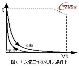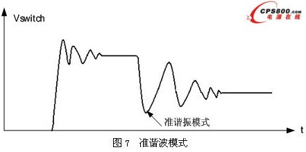 一般來(lái)說(shuō),可以采用軟開(kāi)關(guān)技術(shù)來(lái)解決開(kāi)關(guān)管的問(wèn)題,如圖6所示。圖6給出了開(kāi)關(guān)管工作在軟開(kāi)關(guān)條件下的開(kāi)關(guān)軌跡。軟開(kāi)關(guān)技術(shù)主要減小開(kāi)關(guān)管上的開(kāi)關(guān)損耗,也可以抑制開(kāi)關(guān)管上的電磁干擾。在所有的軟開(kāi)關(guān)技術(shù)中,準(zhǔn)諧振抑制開(kāi)關(guān)管上電磁干擾的效果比較好,所以本文以準(zhǔn)諧振技術(shù)為例,介紹軟開(kāi)關(guān)技術(shù)抑制EMI。所謂準(zhǔn)諧振就是開(kāi)關(guān)管在電壓谷底開(kāi)通,見(jiàn)圖7。開(kāi)關(guān)中寄生電感與電容作為諧振元件的一部分,可完全控制開(kāi)關(guān)導(dǎo)通時(shí)電流浪涌與斷開(kāi)時(shí)電壓浪涌的發(fā)生。采用這種方式不僅能把開(kāi)關(guān)損耗減到很小,而且能降低噪聲。谷底開(kāi)關(guān)要求關(guān)斷時(shí)間中儲(chǔ)存在中的能量必須在開(kāi)關(guān)開(kāi)通時(shí)釋放掉。它的平均損耗為,由此公式可以看出,減小會(huì)導(dǎo)致大大降低,從而減小開(kāi)關(guān)上的應(yīng)力,提高效率,減小dv/dt,即減小EMI。
