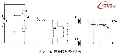 圖8為L(zhǎng)LC串聯(lián)諧振的拓?fù)浣Y(jié)構(gòu)。從圖中可以看出,兩個(gè)主開(kāi)關(guān)Ql和Q2構(gòu)成一個(gè)半橋結(jié)構(gòu),其驅(qū)動(dòng)信號(hào)是固定50%占空比的互補(bǔ)信號(hào),電感Ls、電容Cs和變壓器的勵(lì)磁電感Lm構(gòu)成一個(gè)LLC諧振網(wǎng)絡(luò)。在LLC串聯(lián)諧振變換器中,由于勵(lì)磁電感Lm串聯(lián)在諧振回路中,開(kāi)關(guān)頻率可以低于LC的本征諧振頻率fs,而只需高于LLC的本征諧振頻率fm便可實(shí)現(xiàn)主開(kāi)關(guān)的零電壓開(kāi)通。所以,LLC串聯(lián)諧振可以降低主開(kāi)關(guān)管上的EMI,把電磁輻射干擾(EMI)減至最少。在LLC諧振拓?fù)渲校灰C振電流還沒(méi)有下降到零,頻率對(duì)輸出電壓的調(diào)節(jié)趨勢(shì)就沒(méi)有變,即隨著頻率的下降輸出電壓將繼續(xù)上升,同時(shí)由于諧振電流的存在,半橋上下兩個(gè)主開(kāi)關(guān)的零電壓開(kāi)通條件就得以保證。因此,LLC諧振變換器的工作頻率有一個(gè)下限,即Cs與Ls和Lm的串聯(lián)諧振頻率fm。在工作頻率范圍fm<f<fs內(nèi),原邊的主開(kāi)關(guān)均工作在零電壓開(kāi)通的條件下,并且不依賴(lài)于負(fù)載電流的大小。同時(shí),副邊的整流二極管工作在斷續(xù)或臨界斷續(xù)狀態(tài)下,整流二極管可以零電流條件下關(guān)斷,其反向恢復(fù)的問(wèn)題得以解決,不再有電壓尖峰產(chǎn)生。