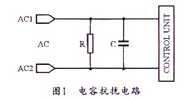 為防止控制板電路產(chǎn)生的傳導(dǎo)干擾,可在電路的進(jìn)人口(即AC兩端)并接上一個(gè)電容C,圖1所示是一個(gè)簡單的電容抗擾電路連接圖。圖中的電容屬于安全電容,但必須在該電容的兩端并聯(lián)一個(gè)安全電阻,以用于防止電源線拔插時(shí)電源線插頭長時(shí)間帶電。因?yàn)榘踩珮?biāo)準(zhǔn)規(guī)定,當(dāng)正在工作之中的機(jī)器電源線被拔掉時(shí),在兩秒鐘內(nèi),電源線插頭兩端所帶的電壓(或?qū)Φ仉娢?必須小于原來電壓的30%。