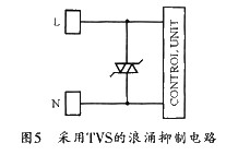 防止浪涌干擾的常用器件有氣體放電管、金屬氧化物壓敏電阻(MOVS)和硅瞬變吸收二級管(TVS)。圖5所示是采用TVS的浪涌抑制電路。