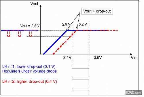 結(jié)論2:對壓降非常小的線性穩(wěn)壓器要求更加嚴(yán)格,因為電池電壓隨著時間的推移會降低,比如降至2.9V。在整個電池電壓范圍內(nèi)保持穩(wěn)定電壓很重要,由此得到的結(jié)論是壓降越低,電池有效供電時間就越長。