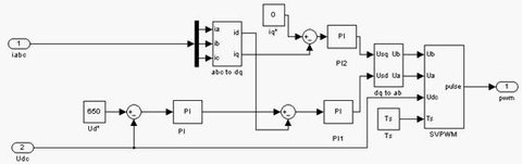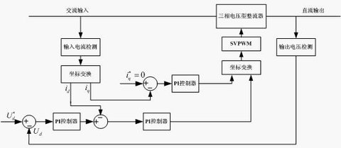 其中,空間電壓矢量控制通過合理地選擇、安排開關(guān)狀態(tài)的轉(zhuǎn)換順序和通斷持續(xù)時間,改變多個脈沖寬度調(diào)制電壓的波形寬度及其組合,達(dá)到較好的控制。相對SPWM控制,具有電壓利用率高、諧波含量小、大大改善了系統(tǒng)的靜態(tài)和動態(tài)性能,具有結(jié)構(gòu)簡單、容易實現(xiàn)、控制精度高等特點。本文采用空間矢量控制的控制策略,并對整流電路采用電壓外環(huán)PI和電流內(nèi)環(huán)PI控制相結(jié)合的方法,建立三相電壓型PWM矢量控制方案的仿真模型,并對其進(jìn)行分析研究。
