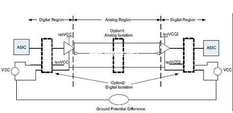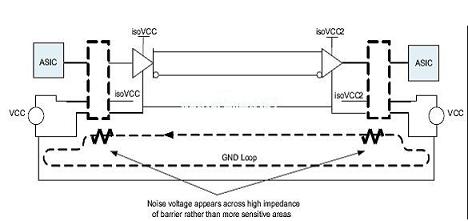 如圖4所示,通過(guò)相對(duì)于其他電路組件而言的高阻抗,隔離中斷了由電路通路形成的環(huán)路。通過(guò)中斷該環(huán)路,噪聲電壓出現(xiàn)在隔離層上,而非出現(xiàn)在接收機(jī)或更為敏感的組件上。噪聲電壓的高電平可以由外部電流或電壓源(例如:電感馬達(dá)和閃電(lightning))耦合。[page]
