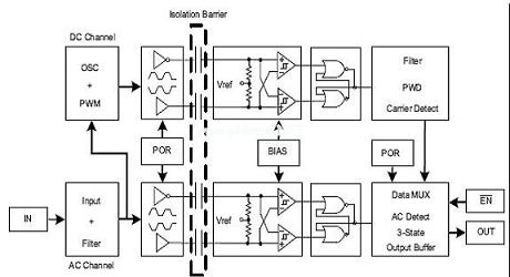 為了提供恒定信息的傳輸,ISO72x使用一個(gè)高信號(hào)速率和低信號(hào)速率通道來(lái)進(jìn)行通信,如圖9所示。高信號(hào)速率通道未被編碼,并且其在一個(gè)單端到差分轉(zhuǎn)換之后的隔離層上傳輸數(shù)據(jù)。該低信號(hào)速率通道以一種脈寬調(diào)制格式對(duì)數(shù)據(jù)進(jìn)行編碼,并在隔離層上差分傳輸數(shù)據(jù),從而確保了恒定狀態(tài)的精確通信(1和0的長(zhǎng)字符)。