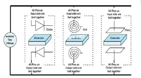 三個(gè)主要標(biāo)準(zhǔn)驗(yàn)證了對(duì)于隔離保護(hù)的必要性,其分別為UL1577、IEC60747-5-2和CSA。雖然每一種標(biāo)準(zhǔn)都稍有不同,但是均提供了一個(gè)對(duì)比隔離性能的標(biāo)準(zhǔn)。IEC、UL和CSA的測(cè)試證實(shí)了輸入和輸出之間電介質(zhì)擊穿以外的電壓。運(yùn)用這些標(biāo)準(zhǔn)非常簡(jiǎn)單,因?yàn)闇y(cè)試標(biāo)準(zhǔn)和隔離方法無(wú)關(guān)。圖10顯示了隔離測(cè)試是如何將隔離器看作是兩端器件的。盡管每種器件的物理結(jié)構(gòu)存在差異,但隔離測(cè)試卻是在電介質(zhì)擊穿電壓上測(cè)定的。