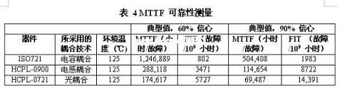 故障前平均工作時(shí)間(MTTF)是半導(dǎo)體設(shè)備可靠性的標(biāo)準(zhǔn)測(cè)量方法。對(duì)于數(shù)字隔離器而言,這種測(cè)量表示集成電路和隔離機(jī)制的可靠性。表4顯示了一款光、電感和電容數(shù)字隔離器的MTTF。與電感及光解決方案相比,ISO721非常可靠。