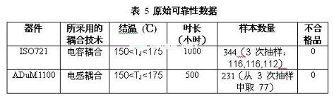 ADuM1100可靠性數(shù)據(jù)表沒(méi)有明確地說(shuō)明MTTF,但是其提供了可靠性測(cè)試的結(jié)果。表5顯示了ISO721和ADuM1100可靠性測(cè)試的參數(shù)。