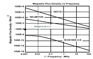 圖12對(duì)比了ADuM1100和ISO72x(沒(méi)有找到HCPL-0900的數(shù)據(jù))的磁場(chǎng)抗擾度。相對(duì)來(lái)說(shuō)盡管這兩個(gè)實(shí)例均對(duì)磁場(chǎng)有一定的抗擾度,但是ISO72x提供了更大的裕度。如前面所述,光耦合隔離層電路對(duì)外部磁場(chǎng)具有內(nèi)在的磁化抗擾度。