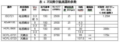 噪聲降低和噪聲保護(hù)使得隔離器在那些隔離器中斷接地環(huán)路并將接地電壓差隔離的電子電路中得到廣泛使用。設(shè)計(jì)人員現(xiàn)在擁有許多用來(lái)進(jìn)行數(shù)字信號(hào)隔離的選擇,包括TI推出的ISO72x系列,其在信號(hào)速率、電介質(zhì)擊穿電壓、瞬態(tài)抗擾度、功耗、磁場(chǎng)抗擾度以及可靠性等重要特性方面均表現(xiàn)不俗。表6對(duì)本報(bào)告中所討論實(shí)例的這些特性進(jìn)行了總結(jié)。