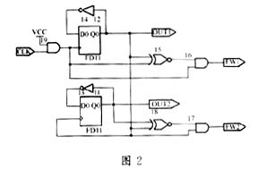 分頻電路可根據(jù)各具體干擾源的脈沖寬度來(lái)確定。具體電路如圖2所示,CLK為8M晶振信號(hào),經(jīng)整形后作為DQ觸發(fā)器的觸發(fā)信號(hào),OUT1輸出二分頻后的4M方波信號(hào),同時(shí)作為下一級(jí)觸發(fā)器的時(shí)鐘信號(hào)OUT2輸出四分頻后的2M方波信號(hào),F(xiàn)W1輸出頻率為4M、脈寬為125ns的脈沖信號(hào),F(xiàn)W2輸出頻率為2M、脈寬為250ns的脈沖信號(hào),具體波形如圖3所示。由此類推,繼續(xù)級(jí)連DQ觸發(fā)器即可輸出八分頻、十六分頻信號(hào),脈寬也可視具體情況而作相應(yīng)的改變,電路類似FW1、FW2的產(chǎn)生電路。