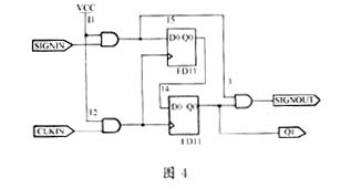 根據(jù)干擾源的情況,以前面所述信號(hào)作為觸發(fā)時(shí)鐘,未經(jīng)處理的信號(hào)源經(jīng)觸發(fā)產(chǎn)生延時(shí),再與其本身相比,這樣,一些干擾信號(hào)由于脈寬過(guò)窄而被濾去。具體電路如圖4所示。