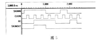 SIGNIN為需處理的信號(hào),被第一個(gè)觸發(fā)器觸發(fā)后,產(chǎn)生延時(shí),同時(shí)送入二級(jí)觸發(fā)器產(chǎn)生二級(jí)延時(shí)。CLKIN信號(hào)的頻率可視干擾源的寬度而定,但需注意的是,干擾源的寬度要遠(yuǎn)遠(yuǎn)小于信號(hào)源的寬度,否則信號(hào)寬度將被大幅削減,導(dǎo)致特性被破壞。電路仿真波形如圖5所示。