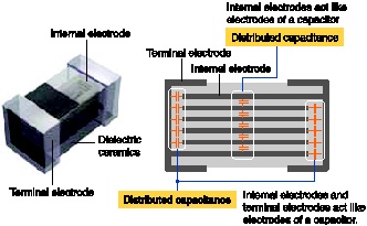 手機(jī)高頻電路系統(tǒng)的電感應(yīng)具有高Q值和小尺寸。然而遺憾的是,如果將線圈變小達(dá)到更微小體積,則造成直流電阻的增加,導(dǎo)致低Q值。另外,更高的頻率范圍的內(nèi)部電極和其它零件的分布寄生電容(未出現(xiàn)在電路圖中的電容)對(duì)Q值的影響很大。線圈感抗(X)與線圈電感和頻率成正比,采用方程式X=2πfL來(lái)定義。理想的電感是指電感值為常數(shù)時(shí),感抗和頻率成正比。因此,頻率和電抗對(duì)比的繪制圖應(yīng)成一條直線,然而在實(shí)際中,更高頻率位置電抗下降,而線圈的分布電容正是造成這一現(xiàn)象的原因。在積層電感中,繞線圖案的作用類似電容電極,會(huì)產(chǎn)生分布電容(圖表二)。同樣,分布電容也存在于端子電極和繞線圖氨之間。