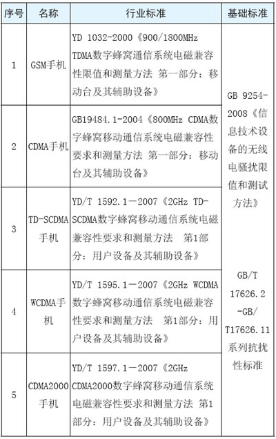 不同制式的手機(jī)電磁兼容測(cè)試時(shí),選擇不同的行業(yè)標(biāo)準(zhǔn),依據(jù)的基礎(chǔ)標(biāo)準(zhǔn)相同,見(jiàn)下表1。