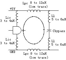 圖5為電流環(huán)的模型。從電流環(huán)模型中我們可以看出,環(huán)路中存在寄生電感,它們在高頻狀態(tài)下表現(xiàn)為環(huán)路的阻抗可導(dǎo)致供給電源產(chǎn)生尖峰,并會(huì)輻射電磁波從而干擾系統(tǒng)的其他部分。環(huán)路中Ll為電容管腳引線的封裝電感;Lpc為電容管腳到器件電源或者地管腳之間的PCB傳輸線的寄生電感;Lic為器件管腳引線的寄生電感。另外,在前面我們討論過電容本身也是具有寄生電感ESL的。這樣回路的總電感為:L=2Ll+2Lpc+2Lic+ESL。由于環(huán)路的寄生電感將會(huì)給整個(gè)系統(tǒng)帶來電磁干擾,產(chǎn)生電壓尖峰,這個(gè)電壓尖峰值同串聯(lián)電感之間存在一定的關(guān)系,近似計(jì)算公式如下: