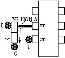 如圖7及圖8(a)所示,為旁路電容的一種放置方式。將芯片的地管腳直接通過一個(gè)低阻抗的過孔D(一般過孔的寄生電感約為1~2nH)連接到地平面上,這樣芯片地管腳上的地彈噪聲將通過過孔流入到地平面上,抑制了地彈噪聲對芯片的影響。芯片的電源管腳通過一小段傳輸線(通常約為50~80mil長,寄生電感約為1~1.6nH)連接到電容的電源盤墊上,電容的電源盤墊和地盤墊直接通過過孔連接到電源平面和地平面上,這樣電源管腳到地平面之間也將有一條低阻抗的通路,有效的克服了電源管腳上的電源噪聲對芯片的影響。同時(shí)旁路電容附近的電源層上的噪聲也將通過過孔B、旁路電容、過孔C這樣一條低阻抗通道流入到地平面上,這樣的放置方式有效的抑制了噪聲對芯片以及電源和其他系統(tǒng)的影響。