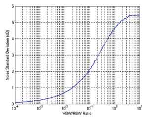 指定視頻濾波器關(guān)閉(或不小于3倍RBW)的目的,是為了消除視頻濾波器對(duì)檢測(cè)到的信號(hào)的影響。圖4是視頻帶寬(VBW)與RBW之比變化時(shí)視頻帶寬的影響。在VBW≥3*RBW或10*RBW(或失效)時(shí),噪聲標(biāo)準(zhǔn)偏差保持在5.4dB.在VBW=RBW時(shí),例如在TELEC規(guī)范部分章節(jié)中,噪聲變化降低到大約4.7dB.