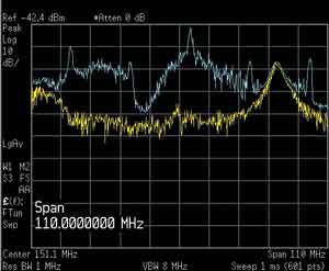 幸運(yùn)的是,測(cè)量技術(shù)的發(fā)展已經(jīng)可以滿足這些需求。上面介紹了如何使用實(shí)時(shí)頻譜分析儀發(fā)現(xiàn)瞬態(tài)信號(hào)和EMI隱患。在下面的實(shí)例中,單個(gè)的瞬態(tài)信號(hào)會(huì)產(chǎn)生一串瞬態(tài)信號(hào),這些信號(hào)每次只持續(xù)很短的時(shí)間。在本例中,該設(shè)備是一種嵌入式系統(tǒng),在把數(shù)據(jù)緩存到硬盤時(shí)導(dǎo)致了瞬態(tài)EMI.在使用掃頻分析儀的峰值檢波器簡(jiǎn)單檢查后(黃色軌跡,如圖6所示),似乎只有一個(gè)連續(xù)信號(hào);把儀器保持Max-hold幾分鐘,同時(shí)循環(huán)DUT工作模式,會(huì)指明問(wèn)題(藍(lán)色軌跡)。但在峰值檢波模式下進(jìn)行快速掃描會(huì)得到黃色軌跡,沒(méi)有檢測(cè)到問(wèn)題。
