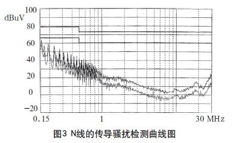 在3m法電波暗室對試驗樣機進行測試,其L、N線的傳導騷擾檢測曲線如圖2、3所示,輻射騷擾的垂直極化掃描曲線如圖4、5所示。